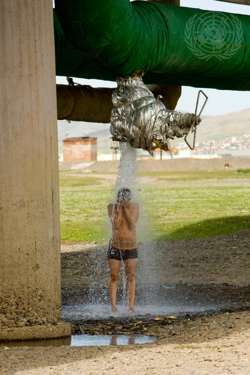 A resident of Ulaanbaatar, capital of Mongolia, showers with water from the city's Tuul River.