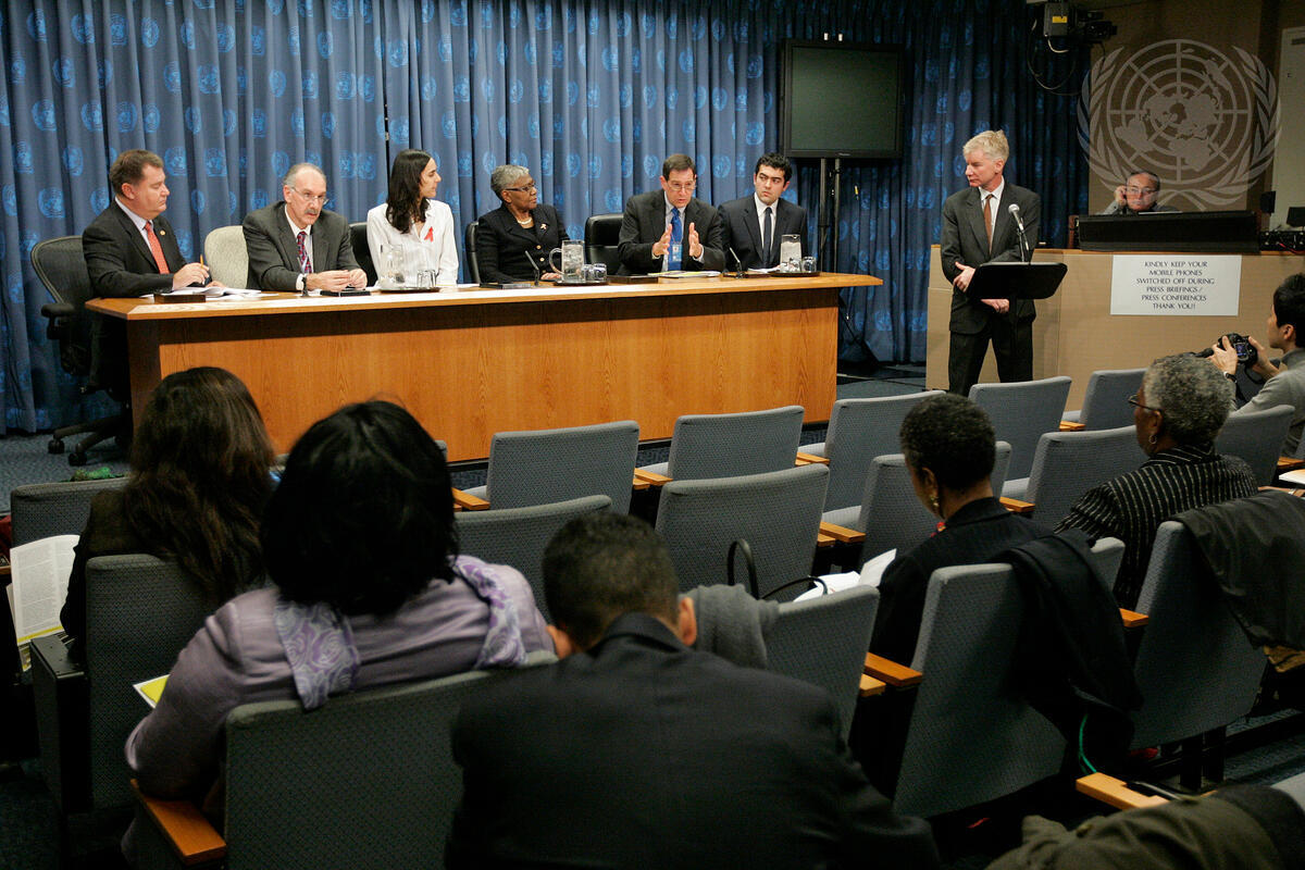 Jimmy Kolker (on panel, second from right), Chief of the United Nations Children's Fund (UNICEF)'s HIV/AIDS Section, speaks at a press conference for the launch of UNICEF's Fourth Children and AIDS Stocktaking Report. His fellow panelists included, from left to right: Bertil Lindblad, Director of the New York Office of the Joint United Nations Programme on HIV/AIDS (UNAIDS); Nathan Shaffer, Senior Adviser for the World Health Organization on Preventing-Mother-to-Child Transmission of HIV; Reshma Pattni, Program Director of the Global Youth Coalition on HIV/AIDS; C. Virginia Fields, President and Chief Executive Officer of the National Black Leadership Commission on AIDS; and Prateek Awasthi, a Youth Participation Consultant at the United Nations Population Fund (UNFPA). Panelists also briefed on the 10th anniversary commemoration of the International symposium, ""The children left behind - An action plan for children orphaned by AIDS-related causes"".