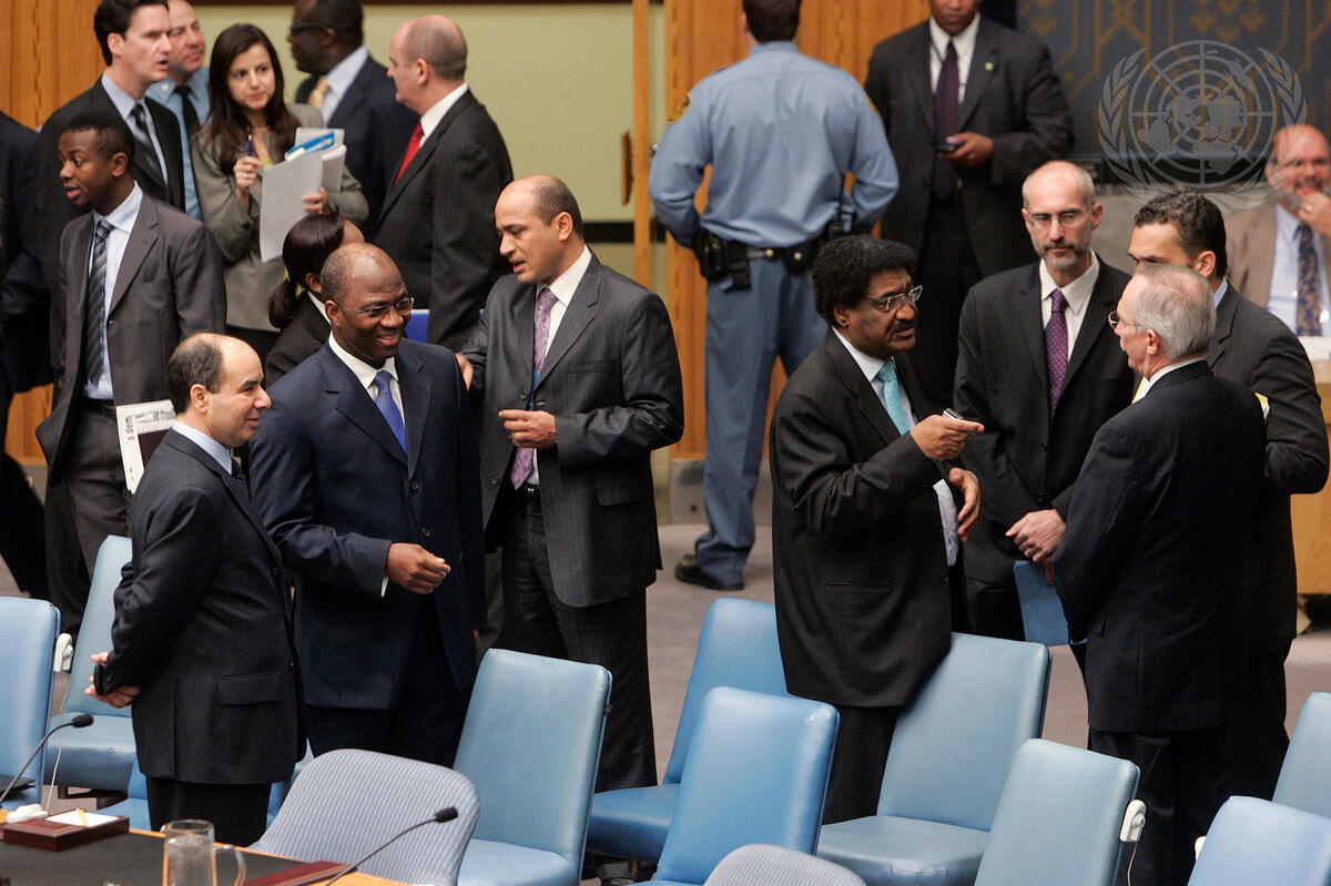 Edmond Mulet (front, right), Assistant Secretary-General for Peacekeeping Operations, speaks with Abdalmahmood Abdalhaleem Mohamad (front, second from right), Permanent Representative of the Republic of the Sudan to the United Nations, during a Security Council meeting on Sudan.
