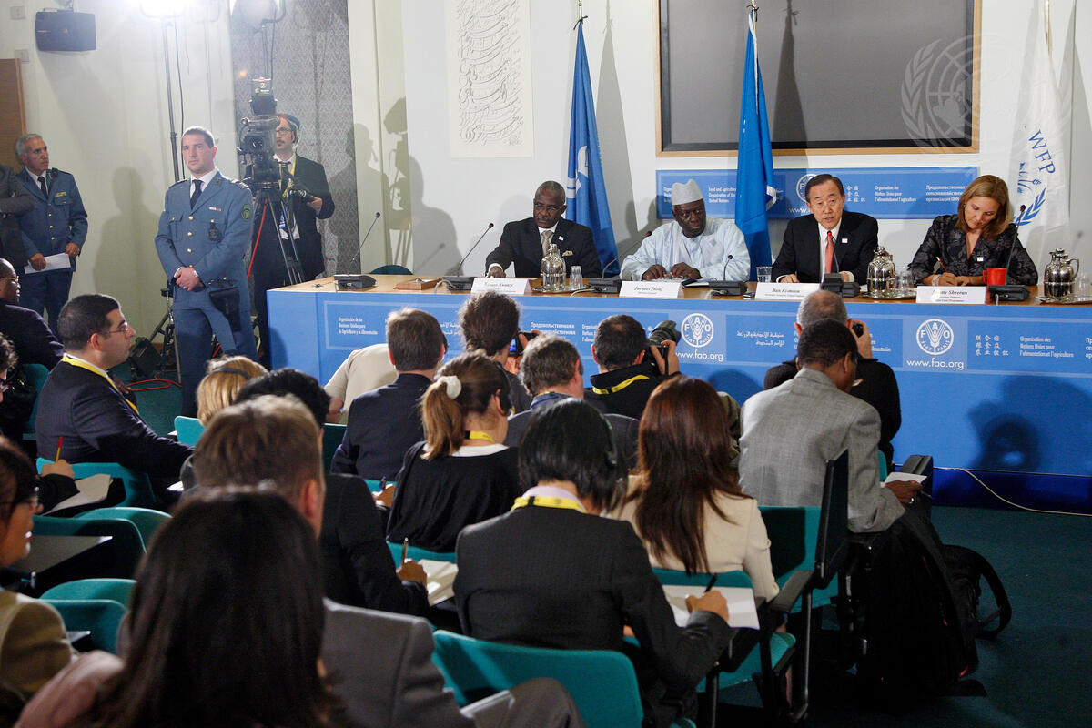 Secretary-General Ban Ki-moon (second from right) holds a joint press conference with, seated from left to right, Kanayo F. Nwanze, President of the International Fund for Agricultural Development (IFAD); Jacques Diouf, Director-General of the Food and Agriculture Organization of the United Nations (FAO); and Josette Sheeran, Executive Director of the United Nations World Food Programme (WFP), in Rome, Italy.