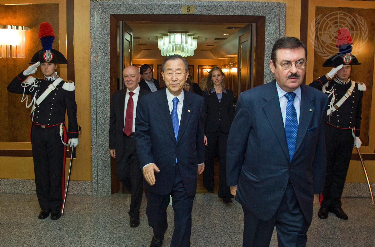 Secretary-General Ban Ki-moon (centre) arrives in Rome, Italy, where he was met by Ambassador Leonardo Visconti di Modrone, Italy's Head of Diplomatic Protocol.