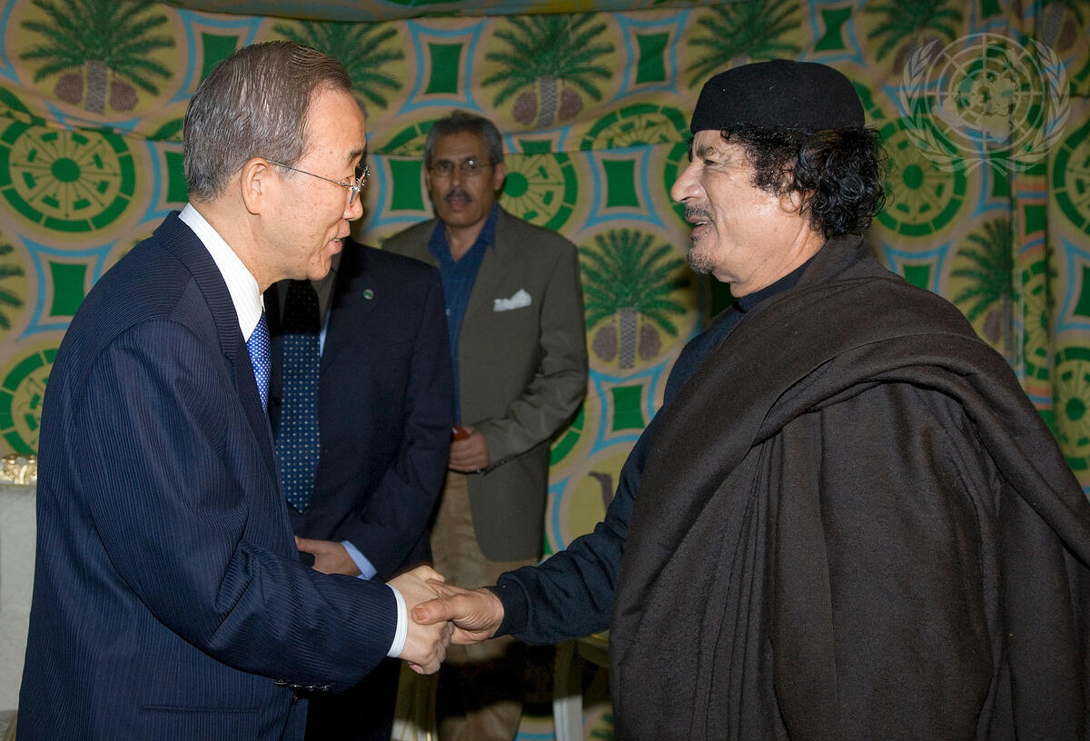 Secretary-General Ban Ki-moon (left) meets with Muammar Al-Qadhafi, Leader of the Socialist People's Libyan Arab Jamahiriya, in Rome, Italy.