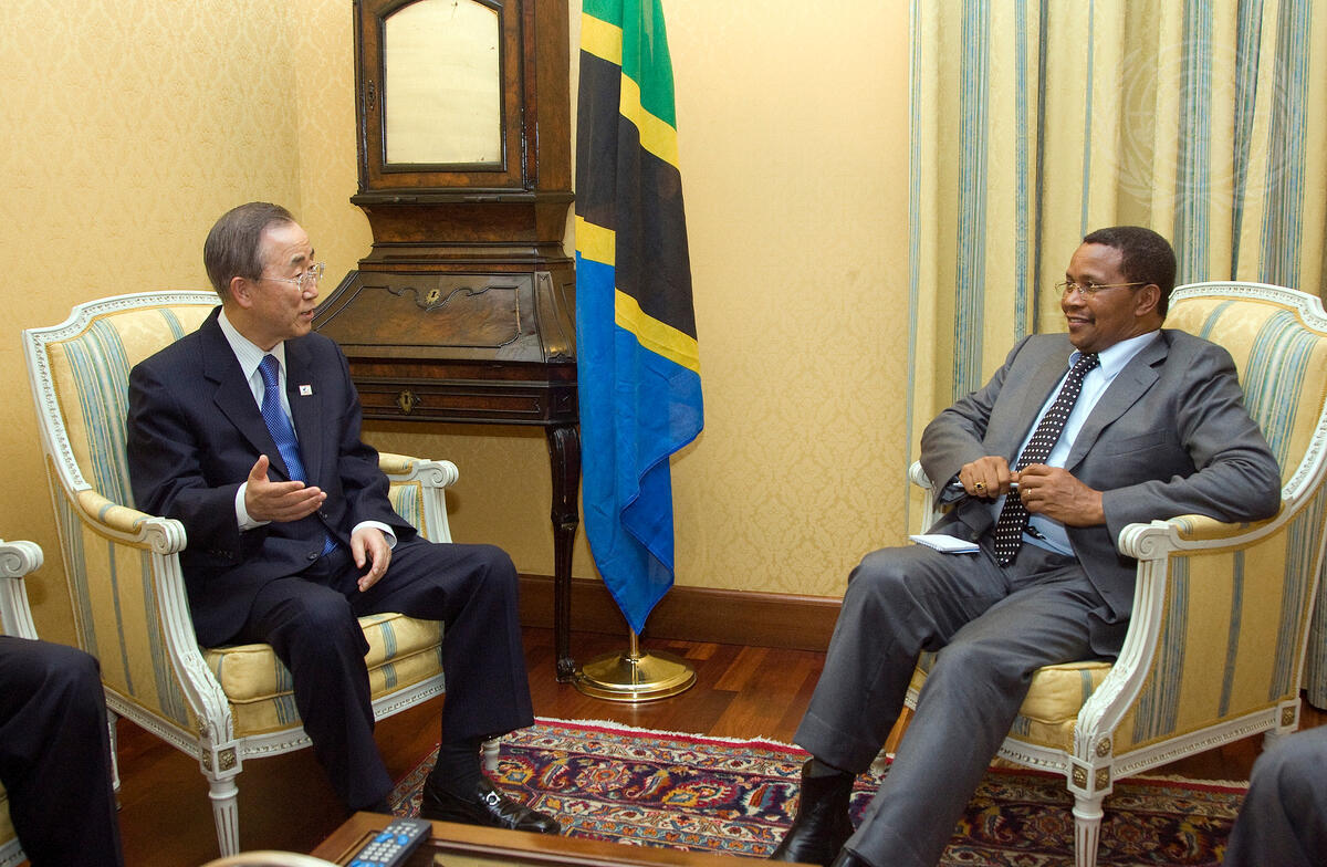 Secretary-General Ban Ki-moon (left) meets with Jakaya Mrisho Kikwete, President of the United Republic of Tanzania, in Rome, Italy.