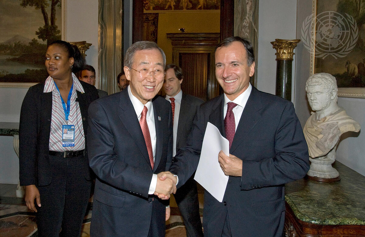 Secretary-General Ban Ki-moon (left) meets with Franco Frattini, Italy's Minister for Foreign Affairs. Mr. Ban and Mr. Frattini co-hosted a working dinner on food security and climate change in Rome, Italy.