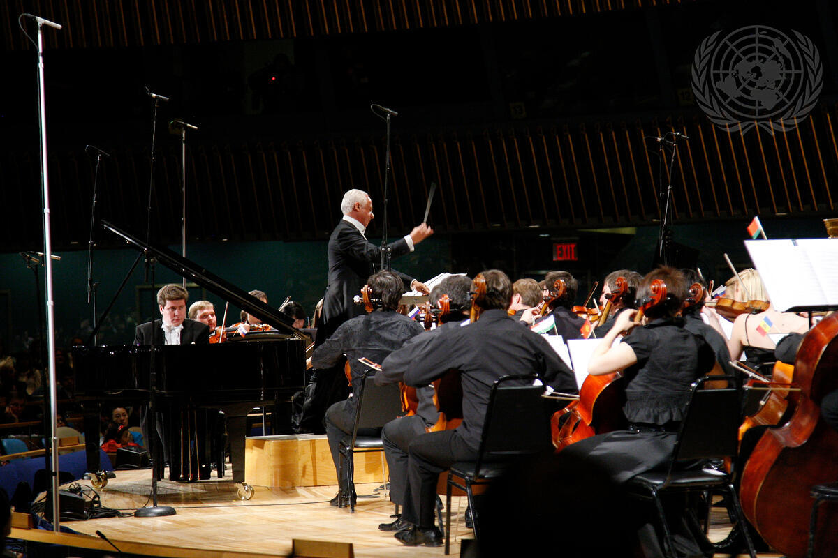 Vladimir Spivakov conducts the Youth Symphony Orchestra of the Commonwealth of Independent States (CIS) as they perform alongside pianist Daniel Matsuev inside the General Assembly Hall. Sponsored by member countries of the CIS, the Youth Symphony played in honour of the 65th Anniversary of the Victory of World War II.