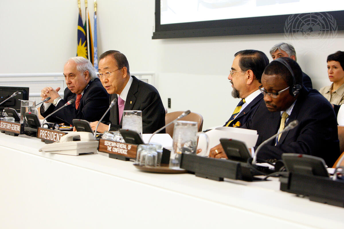 Secretary-General Ban Ki-moon (second from left) addresses the second Conference of States Parties and Signatories to Treaties that Establish Nuclear-Weapon-Free Zones and Mongolia. He is flanked by Sergio de Queiroz Duarte (left), UN High Representative for Disarmament Affairs, and Alfredo Labbé, Director for International and Human Security of Chile and President of the Conference.