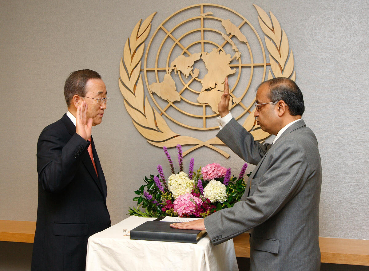 United Nations Secretary-General Ban Ki-moon (left) and Atul Khare during Mr. Khare's swearing-in ceremony as Assistant Secretary-General for Peacekeeping Operations.