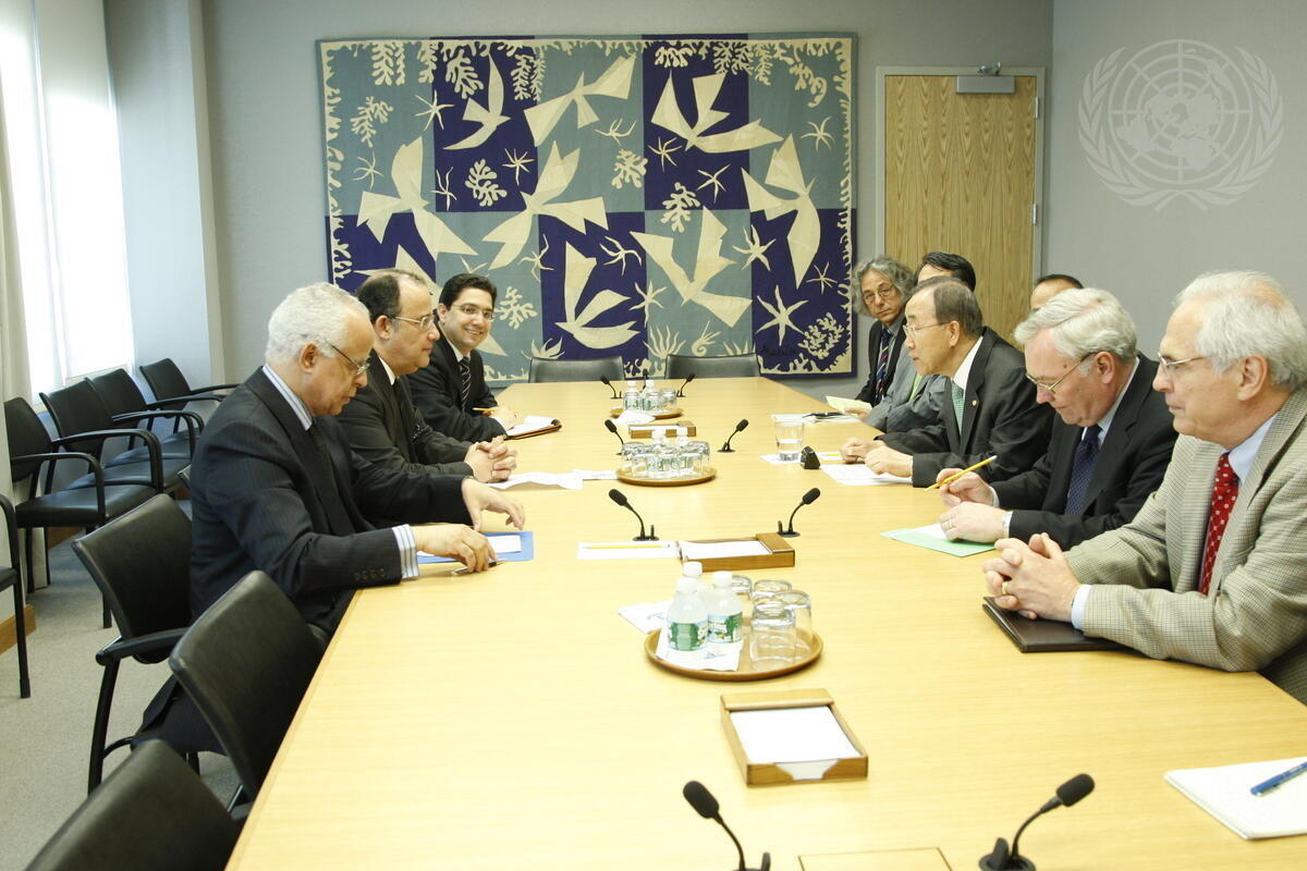 Secretary-General Ban Ki-moon (third from right) meets with Taïb Fassi Fihri (second from left), Minister for Foreign Affairs of the Kingdom of Morocco. Also pictured are B. Lynn Pascoe (second from right), Under-Secretary-General for Political Affairs, and Mohammed Loulichki (left), Morocco’s Permanent Representative to the United Nations.