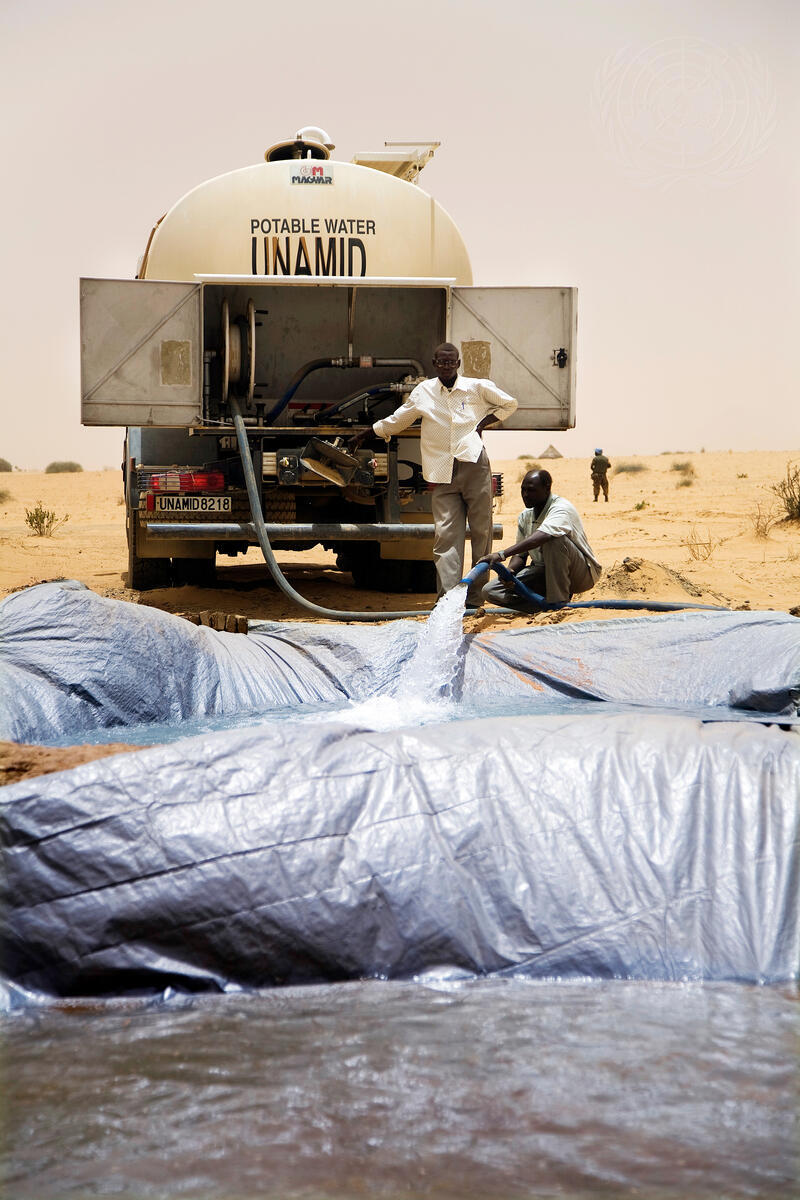 The Disarmament, Demobilization and Reintegration (DDR) Section of the African Union-United Nations Hybrid Operation in Darfur (UNAMID) delivers 40,000 liters of water to Tora village, approximately 50 km north of El Fasher, North Darfur. The water will be used in the construction of a village school which will house 30 former child soldiers.