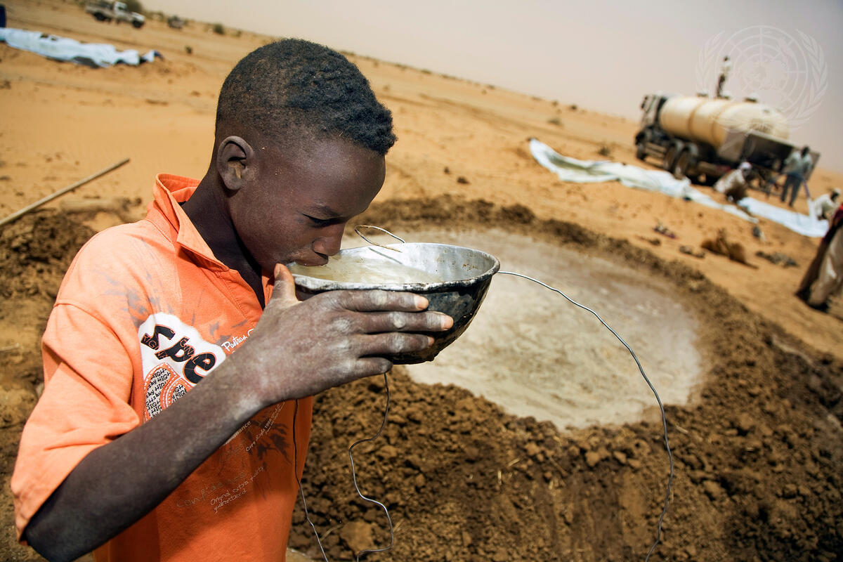 A boy drinks a bowl of newly-delivered water in Tora village, 50 km north of El Fasher, North Darfur. The Disarmament, Demobilization and Reintegration (DDR) Section of the African Union-United Nations Hybrid Operation in Darfur (UNAMID) delivered approximately 40,000 liters of water for the construction of a school which will house 30 former child soldiers.