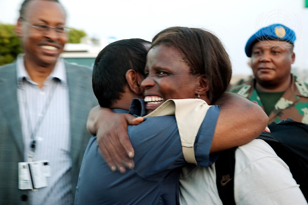 A South African peacekeeper (front, right) serving with the African Union-United Nations Hybrid Operation in Darfur (UNAMID) embraces a colleague as she returns to Nyala, Sudan. She and three other unarmed South African UNAMID staff were abducted near their living quarters in South Darfur and held in captivity for 16 days. All four were subsequently released.