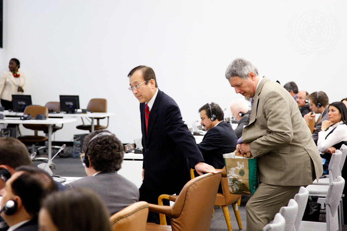 Tadatoshi Akiba (left, standing), Mayor of Hiroshima, Japan, arrives at the second Conference of States Parties and Signatories to Treaties that Establish Nuclear-Weapon-Free Zones and Mongolia, at UN Headquarters.