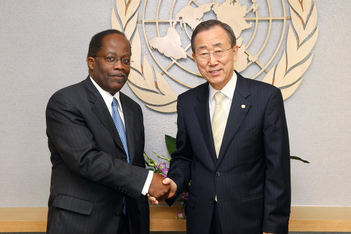Christopher Fitzherbert Hackett (left), Permanent Representative of Barbados to the UN, pays a farewell call on Secretary-General Ban Ki-moon.