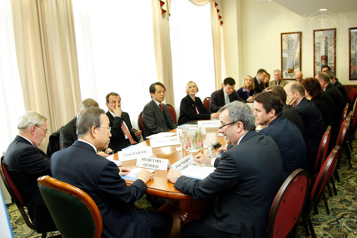 Secretary-General Ban Ki-moon (second from left) meets with the UN Country Team (composed of all representatives of UN agencies in Russia) in Moscow, Russia. He is flanked by B. Lynn Pascoe (left), Under-Secretary-General for Political Affairs, and Frode Mauring (right), UN Resident Coordinator in Russia.