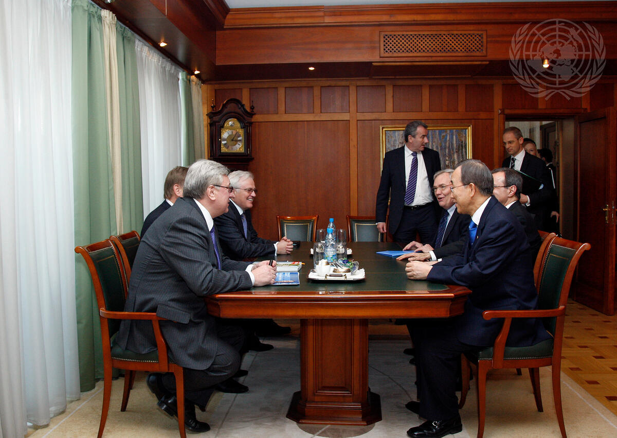 Secretary-General Ban Ki-moon (right) meets with Anatoly V. Torkunov (left), Rector of the Moscow State Institute of International Relations (MGIMO-University), before receiving his honorary degree from the University, in Moscow, Russia. Mr. Ban is accompanied by B. Lynn Pascoe (seated third from right), Under-Secretary-General for Political Affairs.