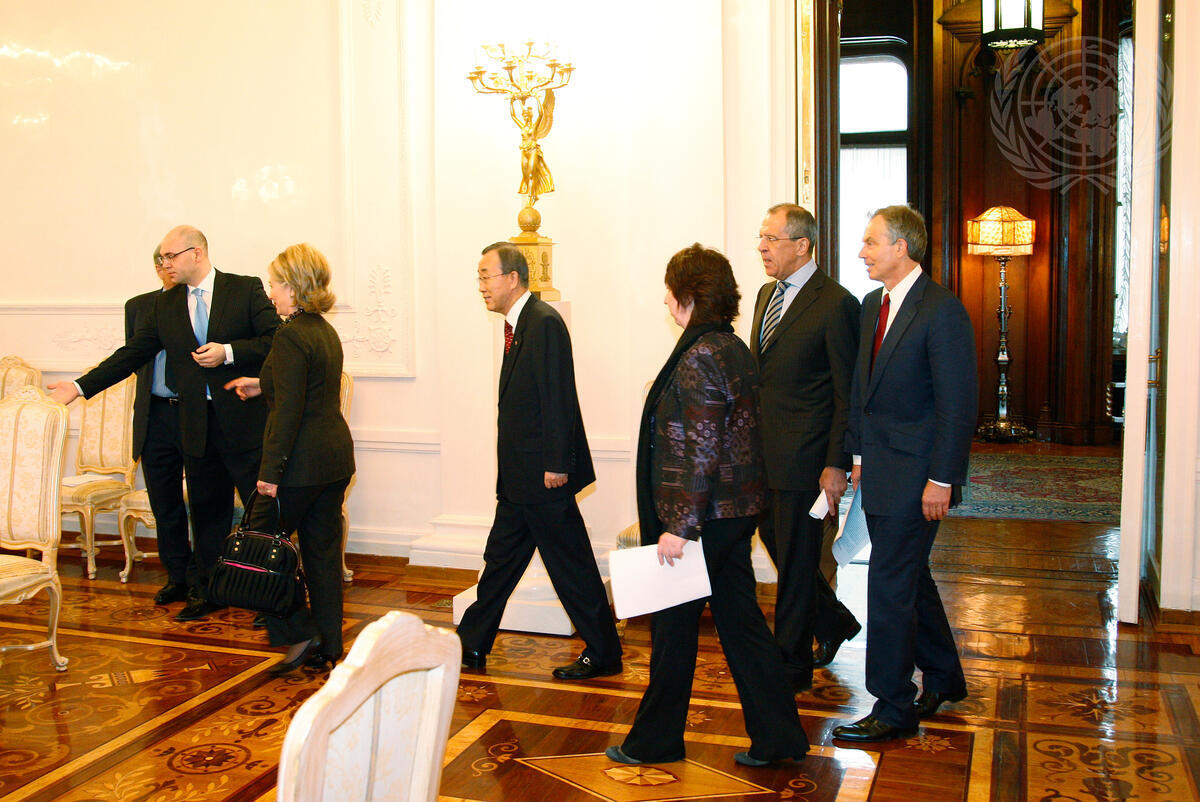 Secretary-General Ban Ki-moon (third from left) arrives at a meeting with representatives of the Middle East Diplomatic Quartet, including Hillary Rodham Clinton (second from left), Secretary of State of the United States of America; Sergey V. Lavrov (second from right), Minister for Foreign Affairs of the Russian Federation; and Tony Blair (right), Special Envoy of the Quartet; at the Foreign Ministry Mansion in Moscow, Russia.