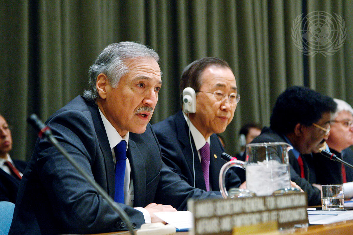 Heraldo Muñoz (left), Permanent Representative of Chile to the United Nations, addresses an informal meeting of the General Assembly on the situation in his country where a powerful earthquake struck on 27 February. Next to Mr. Muñoz is Secretary-General Ban Ki-moon who has recently returned from the earthquake-devastated nation.