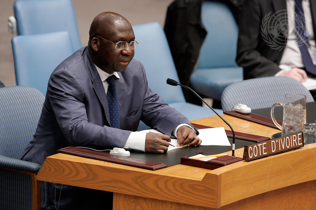 Ilahiri A. Djédjé, Permanent Representative of Côte d'Ivoire to the United Nations, addresses a Security Council meeting on his country.
