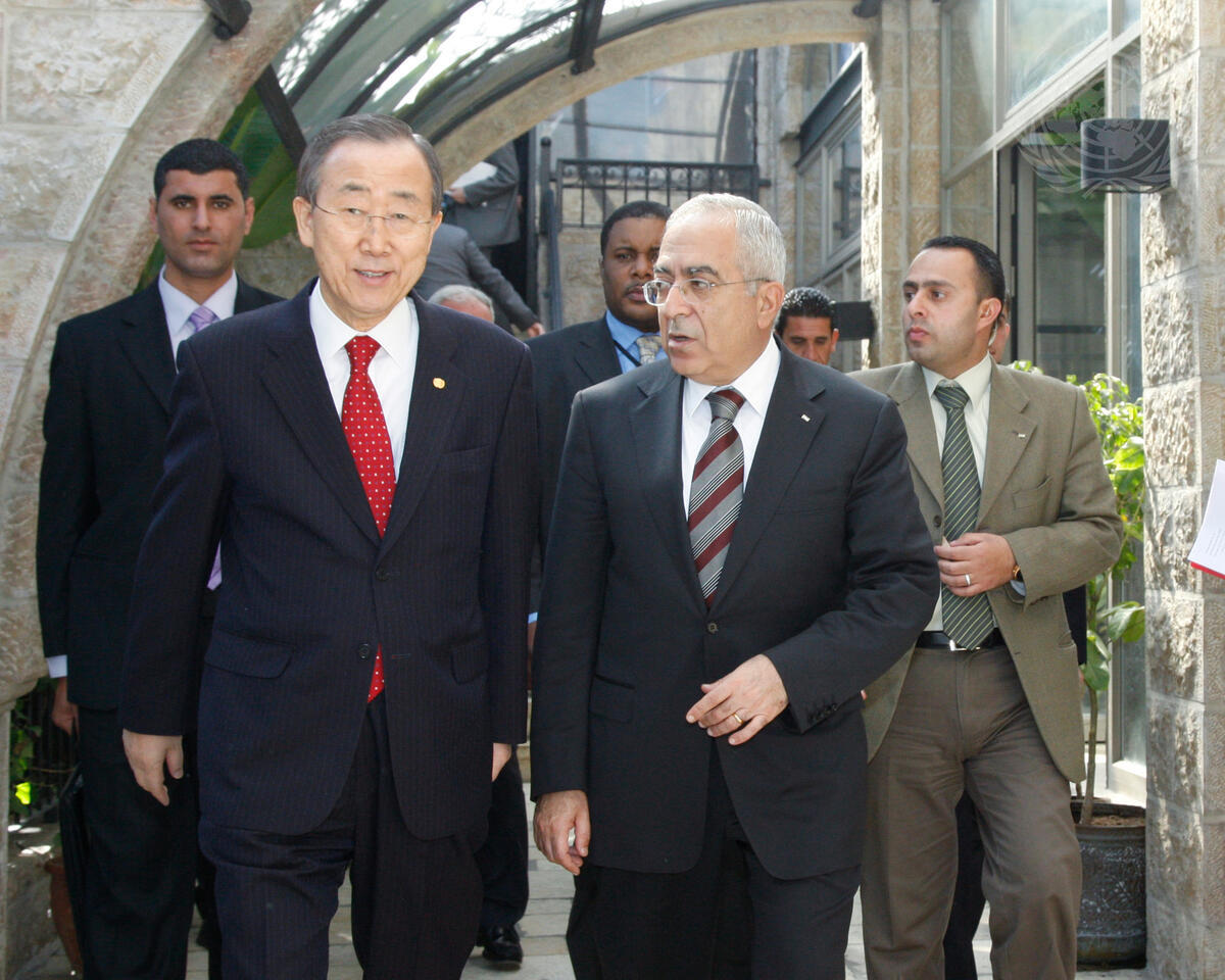 Secretary-General Ban Ki-moon (left) is shown en route to a luncheon hosted by Prime Minister of the Palestinian National Authority Salam Fayyad (right), in Ramallah, West Bank.