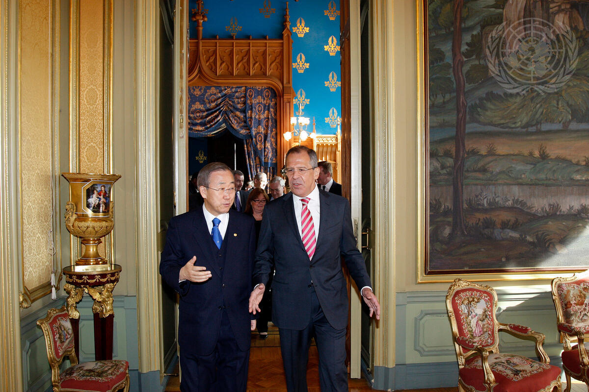 Secretary-General Ban Ki-moon (left) meets with Sergey V. Lavrov, Minister for Foreign Affairs of the Russian Federation, at the Foreign Ministry Mansion in Moscow, Russia.