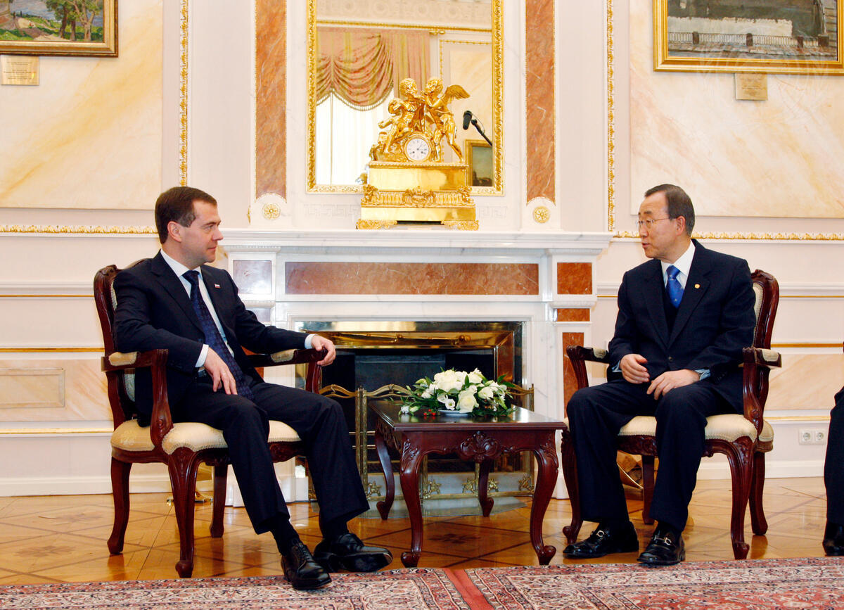 Secretary-General Ban Ki-moon (right) meets with Dmitry A. Medvedev, President of the Russian Federation, at the Kremlin in Moscow, Russia.