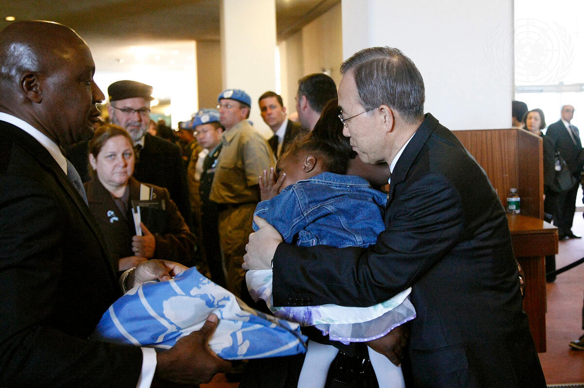 Secretary-General Ban Ki-moon comforts a distressed little girl after an emotional memorial ceremony for UN staff members who perished in Haiti's earthquake.
