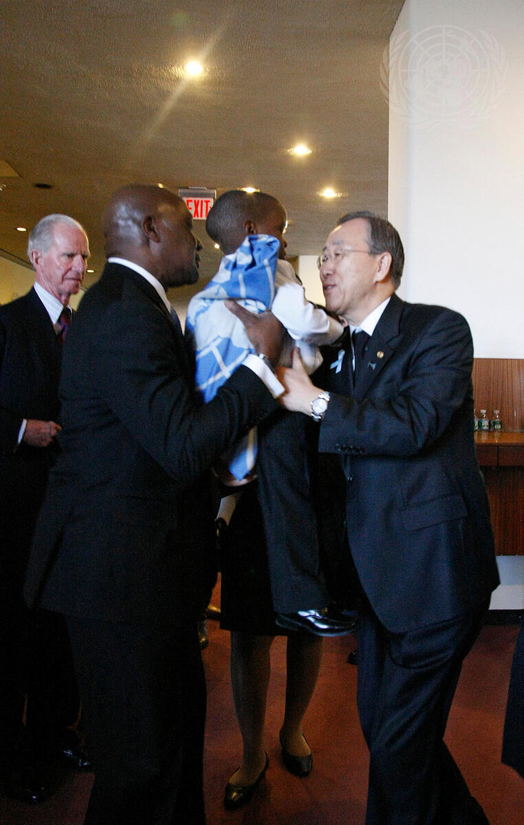 Desmond Parker (left), Deputy Chief of Protocol, lifts a young boy into the arms of Secretary-General Ban Ki-moon following a memorial ceremony at UN Headquarters for staff members who perished in Haiti's earthquake.