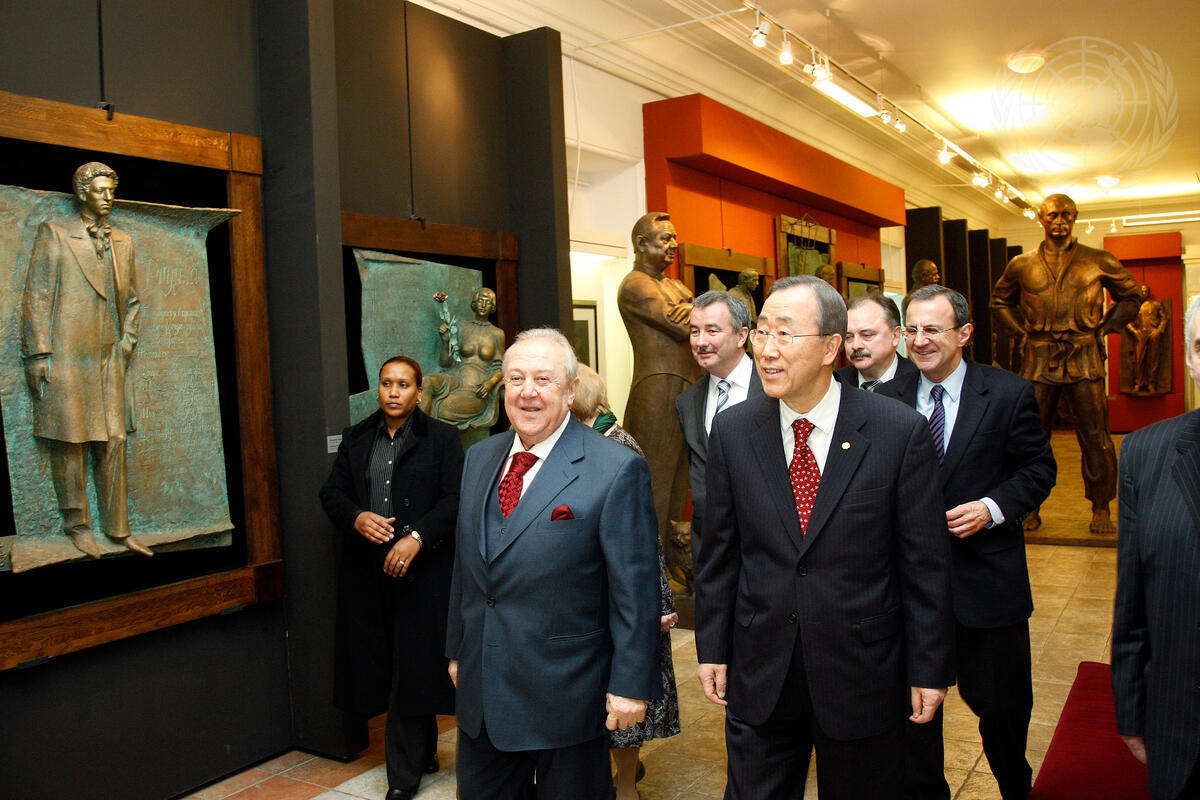 Secretary-General Ban Ki-moon (front, right) is given a tour of the Tsereteli Gallery in Moscow, Russia, by gallery owner and President of the Russian Academy of Arts, Zurab Tsereteli (front, left). Behind Mr. Ban are, Sergei Ordzhonikidze (right), Director-General at the United Nations Office at Geneva, and Frode Mauring (left), UN Resident Coordinator in Russia.