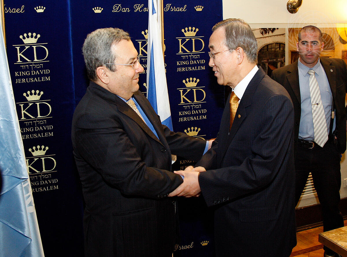Secretary-General Ban Ki-moon (right) meets with Ehud Barak, Deputy Prime Minister and Minister of Defense of Israel, at the King David Hotel in Jerusalem.