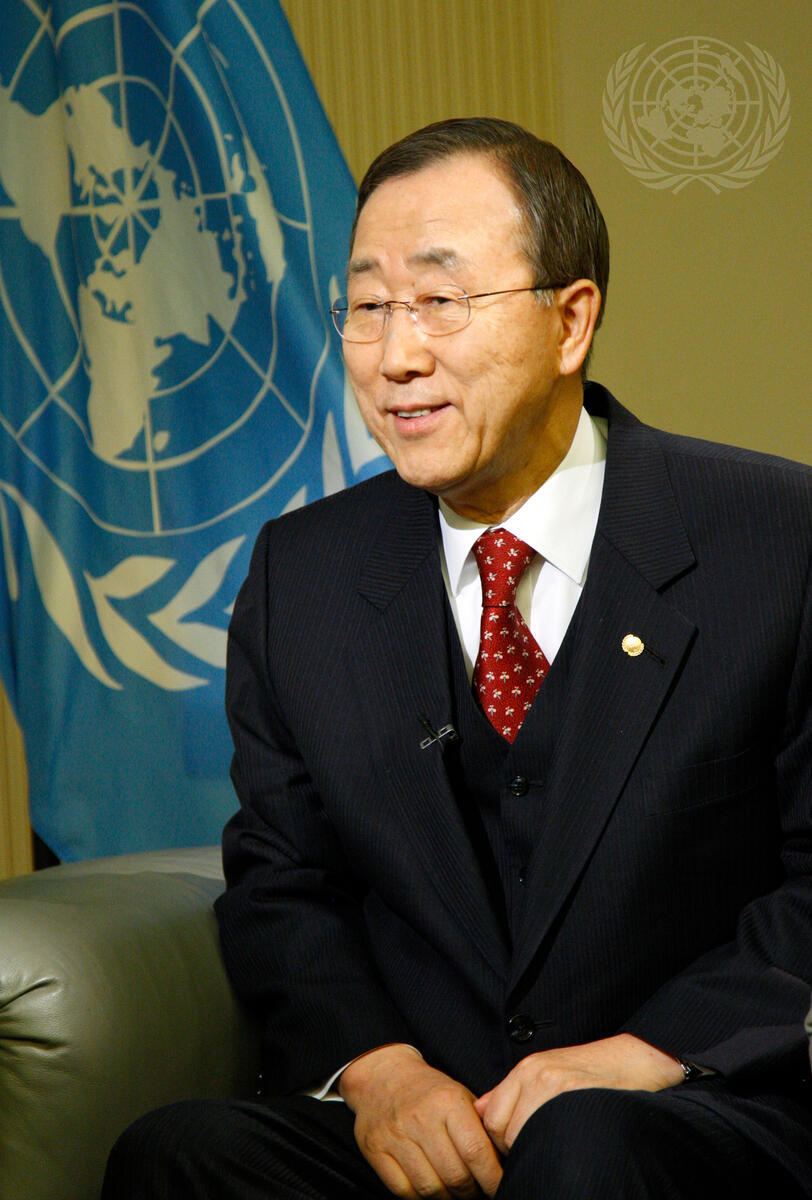Secretary-General Ban Ki-moon sits for a television interview at the UN House in Moscow, Russia.