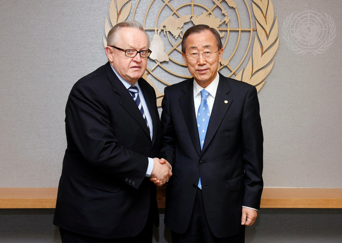 Secretary-General Ban Ki-moon (right) meets with Martti Ahtisaari, former President of Finland and Nobel Peace Laureate.