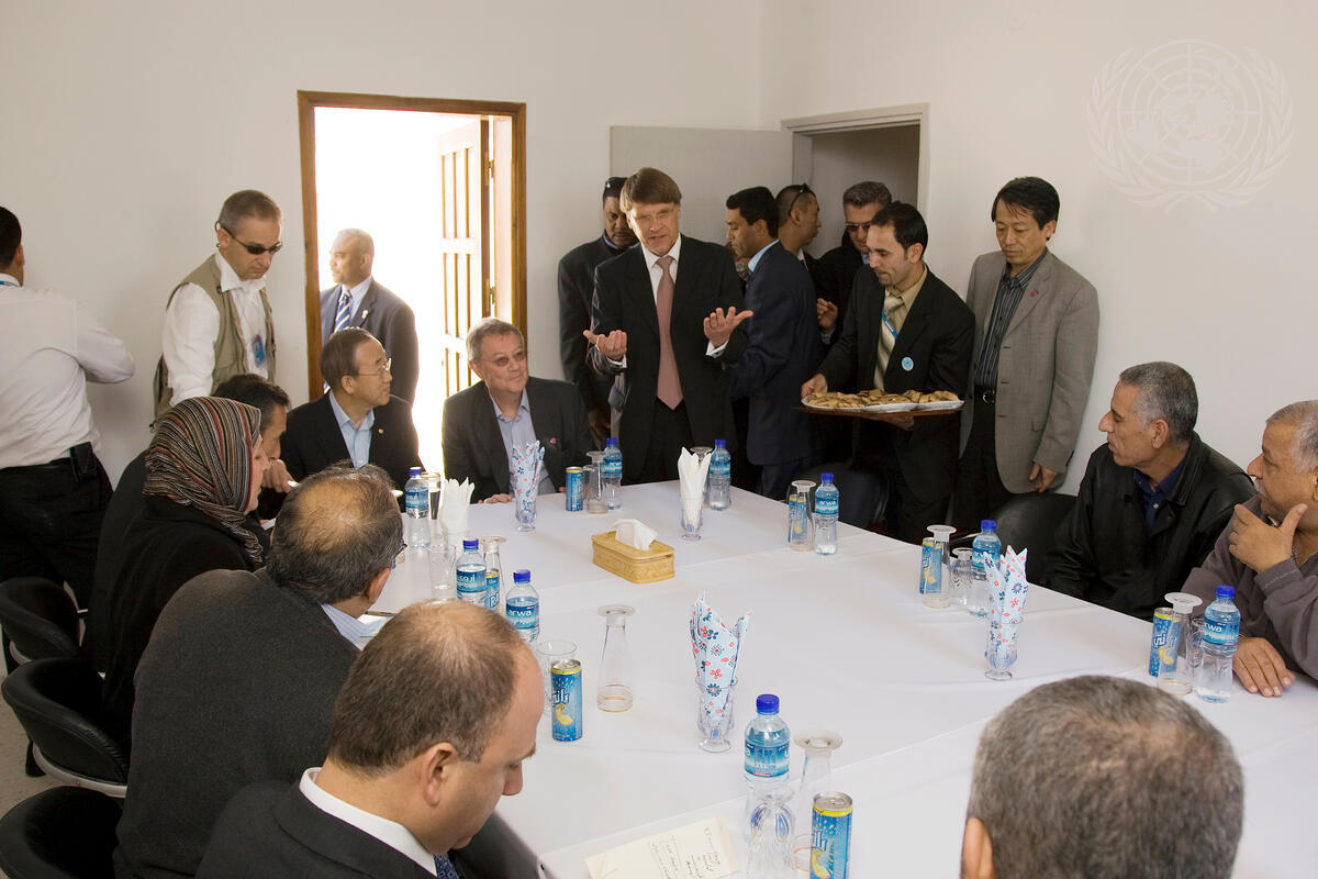 Secretary-General Ban Ki-moon (head of table, left) meets with Gazan business and civil society leaders at the UN-funded housing project site in Khan Younis, Gaza. Also pictured is Robert H. Serry (head of table, right), Special Coordinator for the Middle East Peace Process and Mr. Ban's Personal Representative to the Palestine Liberation Organization and the Palestinian Authority.
