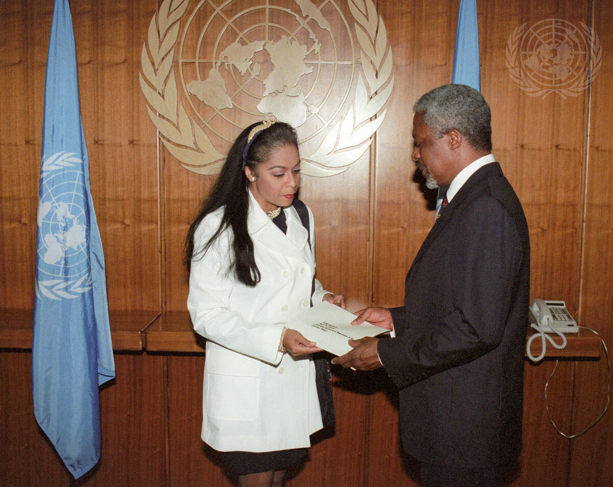 of the Dominican Republic to the United Nations, presents her credentials to Secretary-General Kofi Annan.
