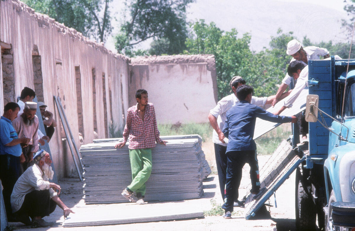 Workers in Tajikabad unload roofing sheets provided by UNHCR for the reconstruction of damaged houses. Khatlon Province, September 1995.
