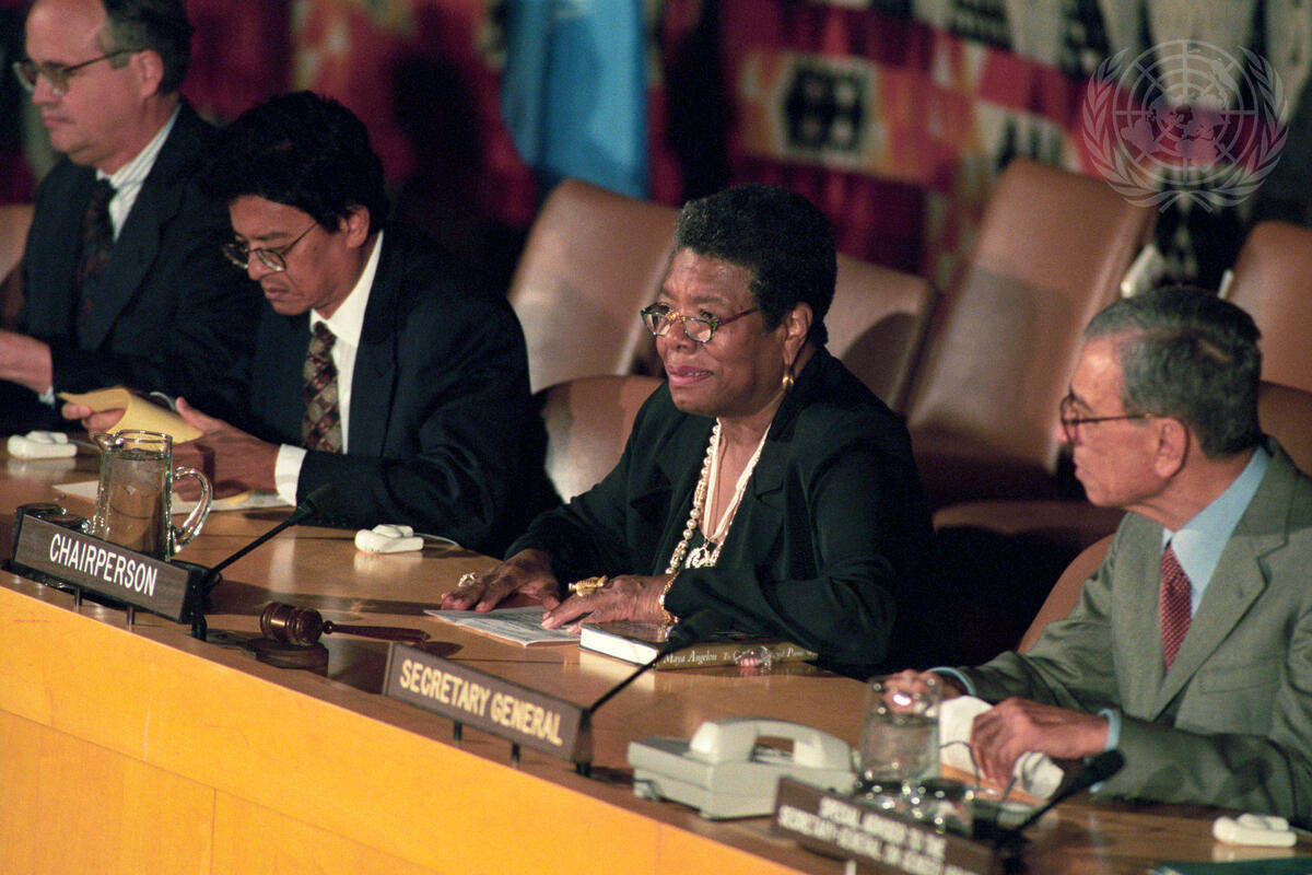 Author and Professor Maya Angelou (second from right) addresses the gathering. On the left is Razali Ismail (Malaysia), President of the 51st session of the General Assembly. On the right is Secretary-General Boutros Boutros-Ghali.