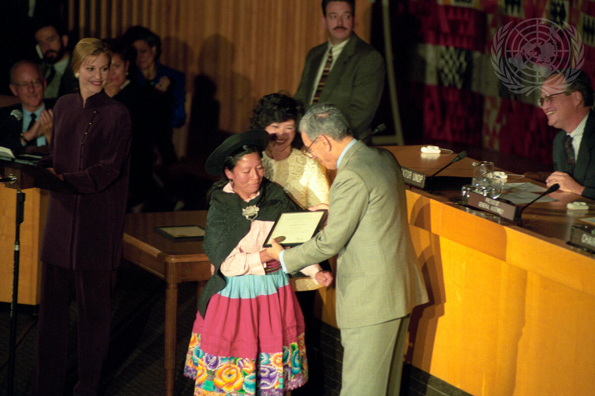Secretary-General Boutros Boutros-Ghali (right) presents an award to Maria Del Carmen, Los Molineras (Peru).