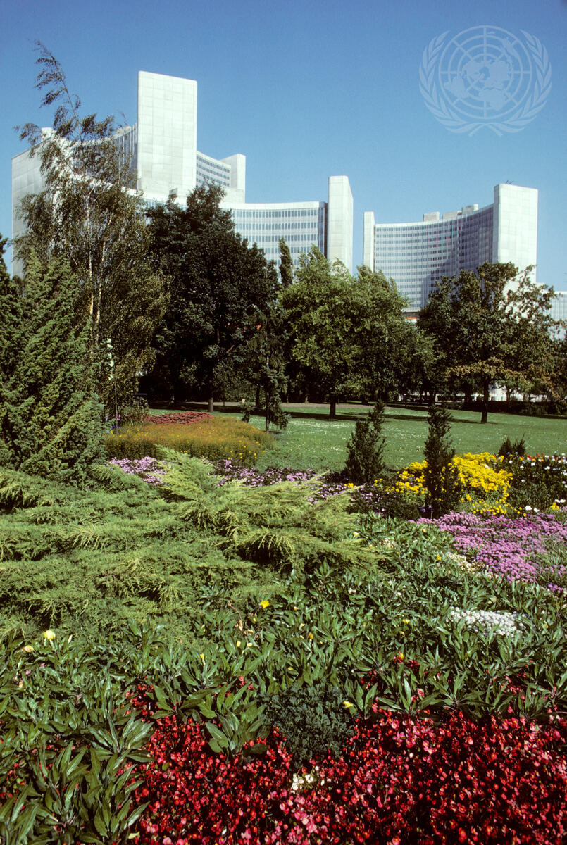 A view of the International Centre which was built by the Austrian Government at a cost of $700 million and offered rent-free to the United nations and its agencies. The individual buildings were designed according to their future use as office, conference or service areas. The centre, which can provide an overall capacity for about 5,000 staff members, is home of the International Atomic Energy Agency (IAEA), and the United Nations Industrial Development Organization (UNIDO). The following UN bodies are also located at the centre: The International Narcotics Control Board and the UN Fund for Drug Abuse Control; the UN International Trade Law Branch (UNCITRAL); the centre for Social Development and Humanitarian Affairs, and the UN Social Affairs Division; the UN Relief and Works Agency for Palestine Refugees in the Near East (UNRWA) and the UN High Commissioner for Refugees (UNHCR-Brach office for Austria). [Exact date unknown]