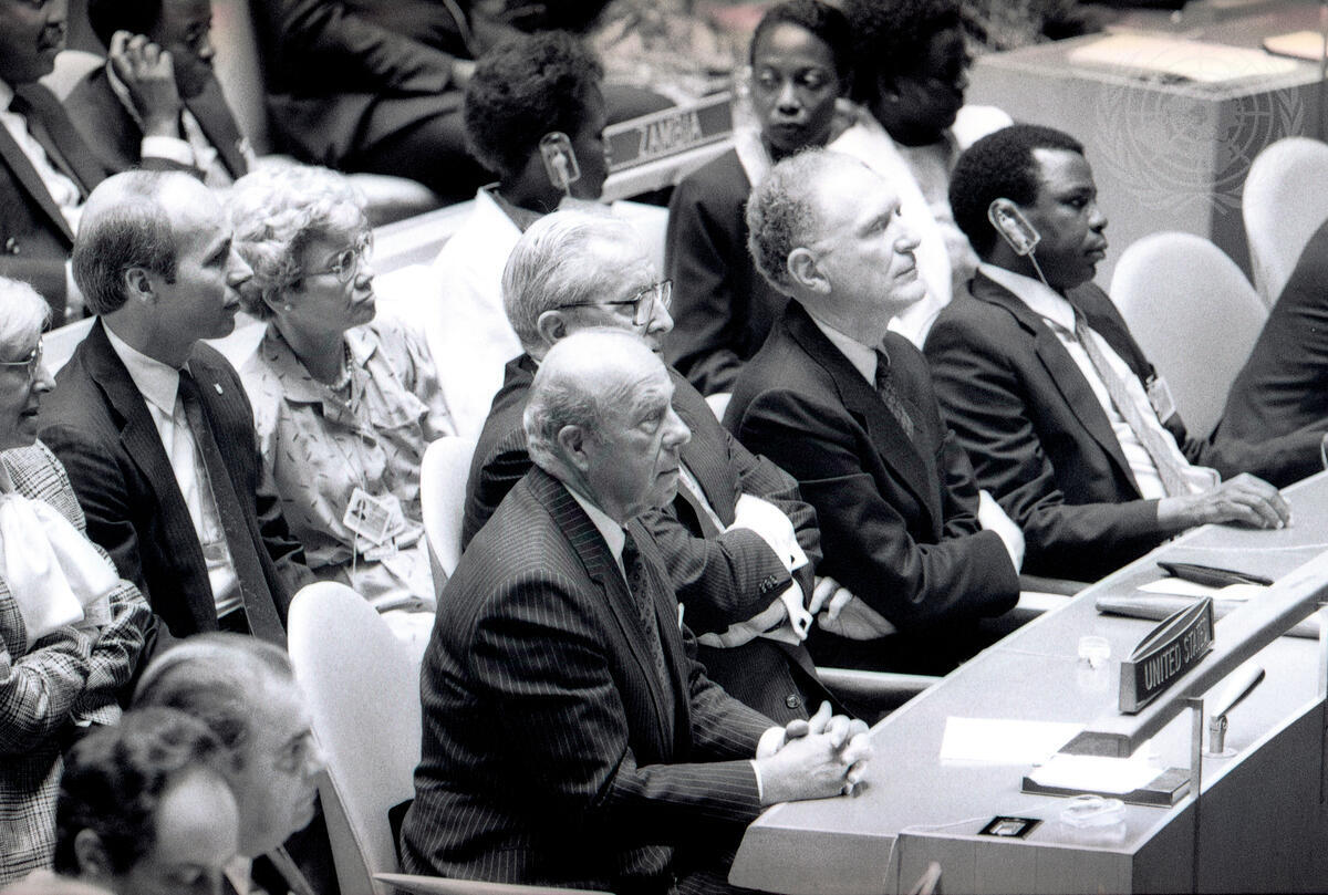 George Shultz (centre), US Secretary of State, and members of the United States delegation listening to the speech of President Ronald Reagan to the forty-second session of the UN General Assembly. Today was opening day of the three-week ""general debate"" during which the head of each delegation makes a formal statement of his or her Government's views on major issues. At the close of the debate, the Assembly begins examination of some 140 items included in this year's provisional agenda. Seated next to Mr. Shultz is Vernon A. Walters, United States Permanent Representative to the UN.