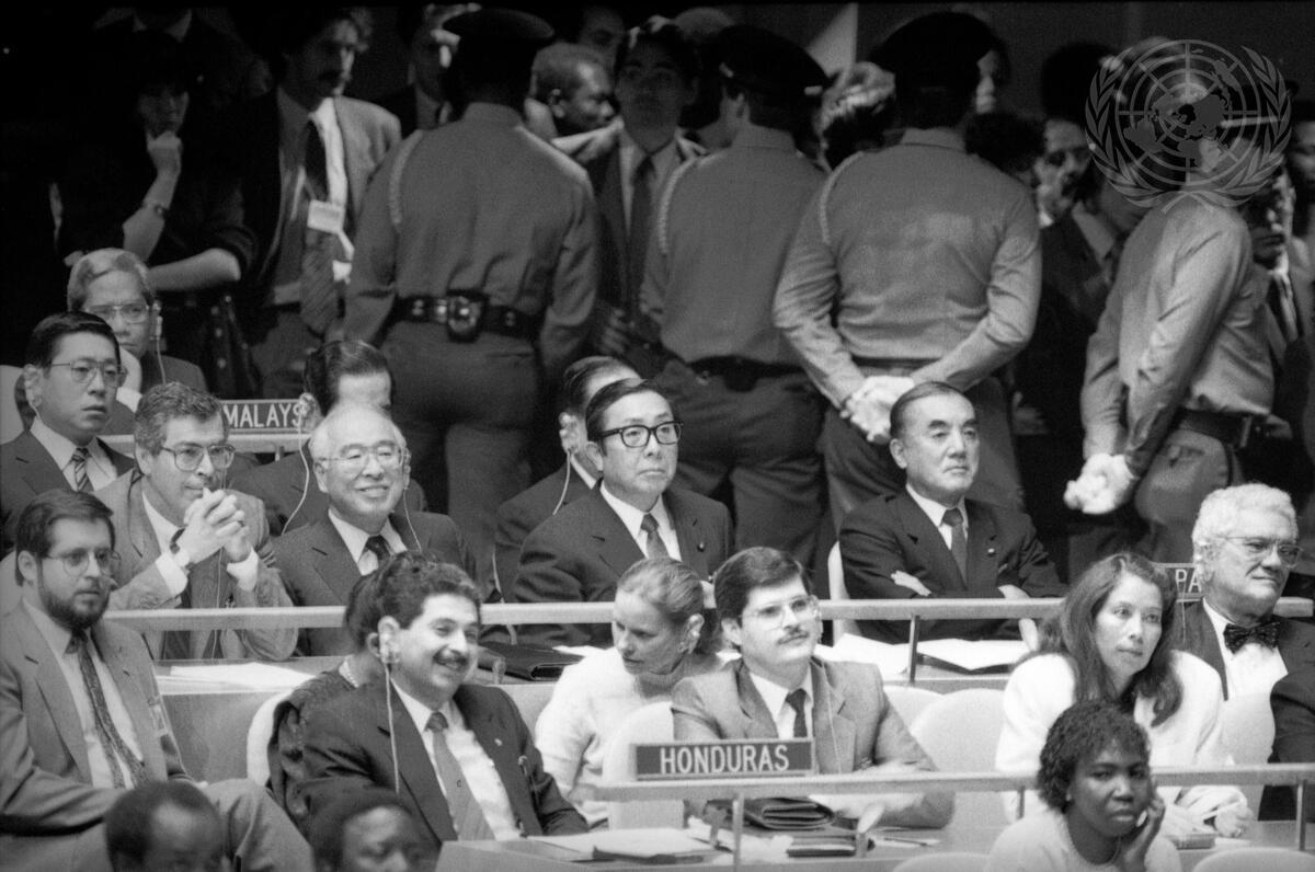 The delegation of Japan headed by Prime Minister Yasuhiro Nakasone (right, behind nameplate) who addressed the forty-second session of the UN General Assembly this morning. The Assembly opened its three-week ""general debate"" today during which the head of each delegation makes a formal statement of his or her Government's views on major issues. At the close of the debate, the Assembly begins examination of some 140 items included in this year's provisional agenda.