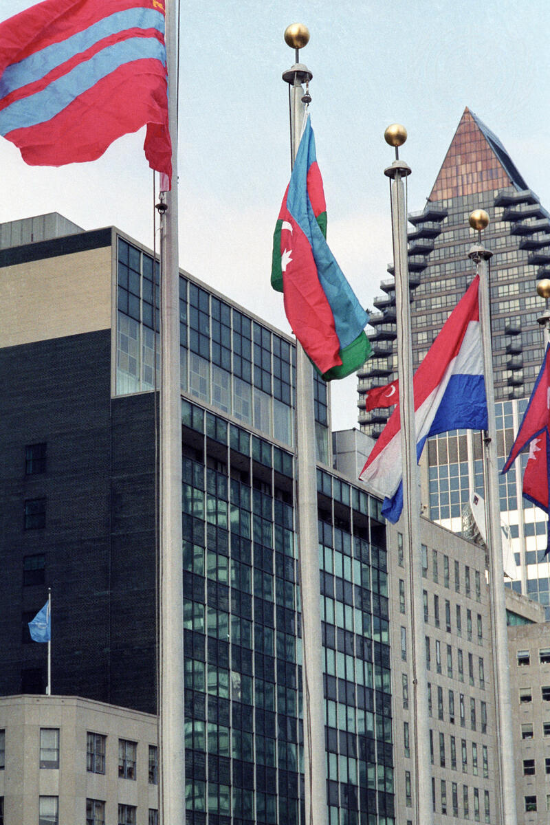 The flag of the Republic of Azerbaijan (second pole from left) is being raised opposite the General Assembly building.
