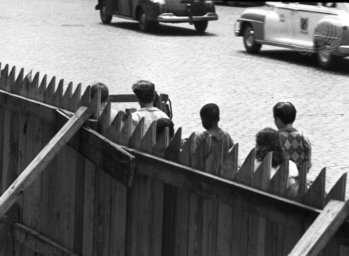 Children, whose former playground was on site of United Nations new headquarters, watch demolition work begin. [Exact date unknown]