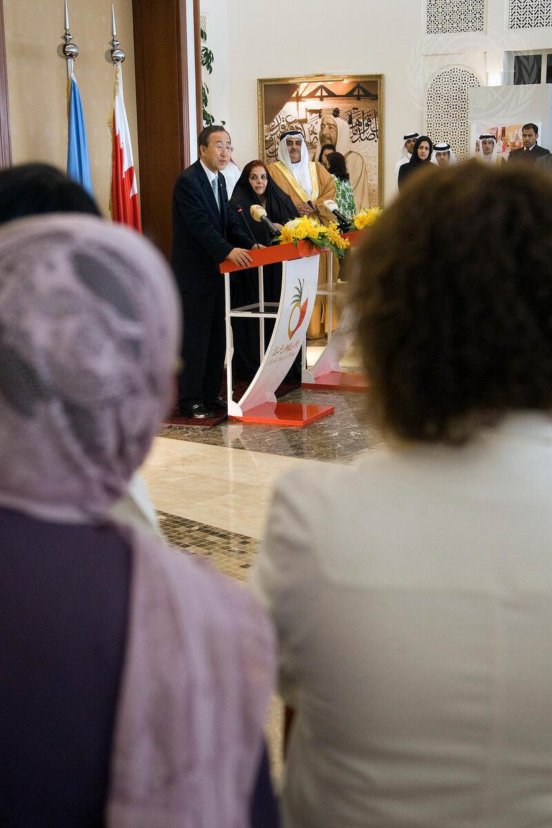 Secretary-General Ban Ki-moon (left, at podium) addresses guests at the signing ceremony for the Women Empowerment Programme between the United Nations and the Supreme Council for Women.