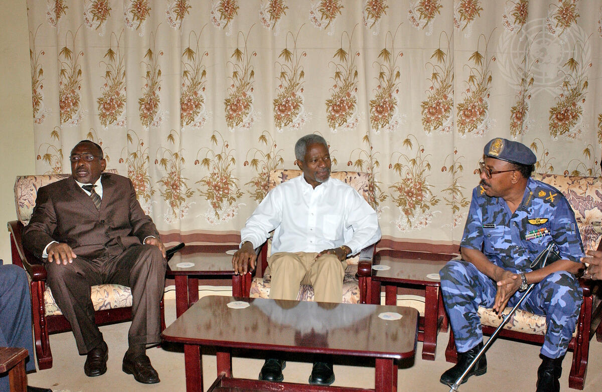 Secretary-General Kofi Annan (centre) meets with local officials in El Fasher shortly before visiting Internally Displaced Persons Zam Zam camp in the Darfur region of Sudan.