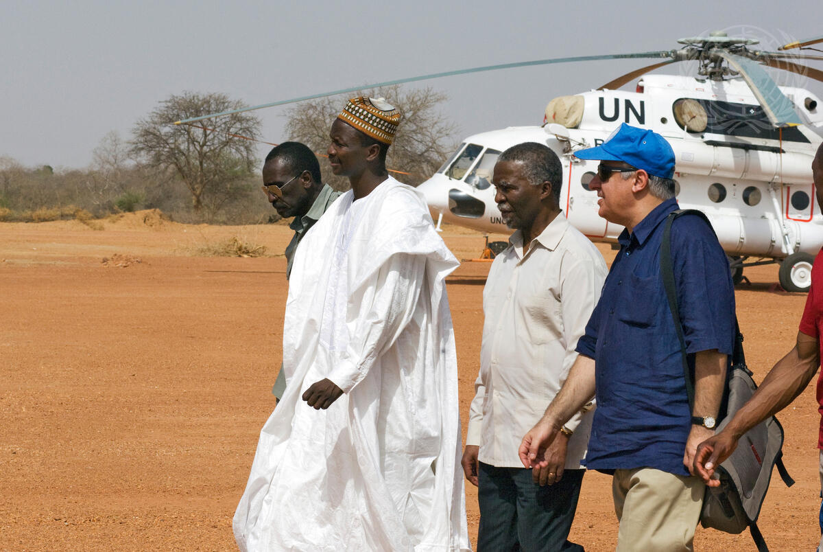 Victor Da Silva Angelo (right), Special Representative of the Secretary-General and Head of United Nations Mission in the Central African Republic and Chad (MINURCAT), guides Thabo Mbeki (second from right), former President of the Republic of South Africa, on an African Union tour of the eastern region of the country.