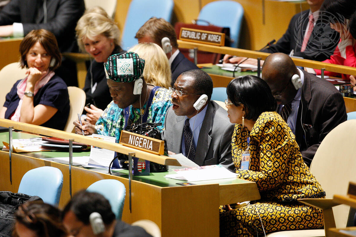 Delegates of Nigeria look at the election result during the General Assembly meeting to elect eighteen new members of the Human Rights Council. Nigeria was elected to a seat on the Human Rights Council.