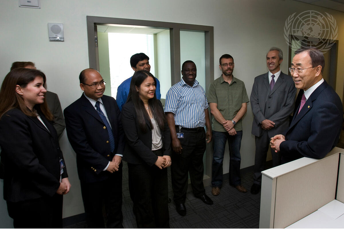 Secretary-General Ban Ki-moon (right) pays a visit to staff members at the United Nations Federal Credit Union (UNFCU) building.