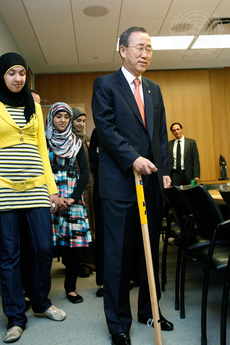 Secretary-General Ban Ki-moon tests out an innovative version of a ""sensor cane"" for the visually impaired alongside the cane's inventors, three students from the School at Askar Camp in Nablus, operated by the United Nations Relief and Works Agency for Palestine Refugees in the Near East (UNRWA). The girls won a ""special award in applied electronics"" at the Intel International Science and Engineering Fair for their breakthrough.