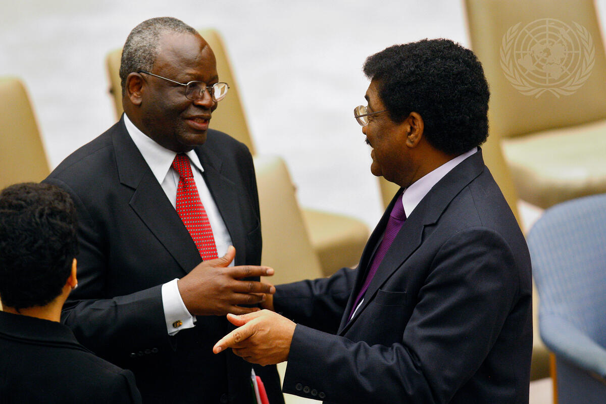 Ibrahim Gambari (left), Joint Special Representative for the African Union-United Nations Hybrid Operation in Darfur (UNAMID), speaks with Abdalmahmood Abdalhaleem Mohamad, Permanent Representative of the Republic of the Sudan to the UN, during a Security Council meeting on UNAMID and the situation in Darfur.