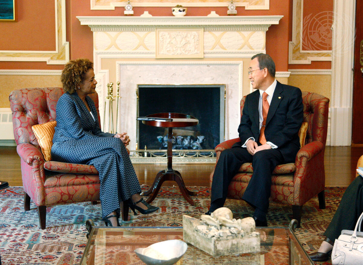 Secretary-General Ban Ki-moon (right) meets with Michaëlle Jean, Governor General of Canada, inside the Government House in Ottawa, Canada.