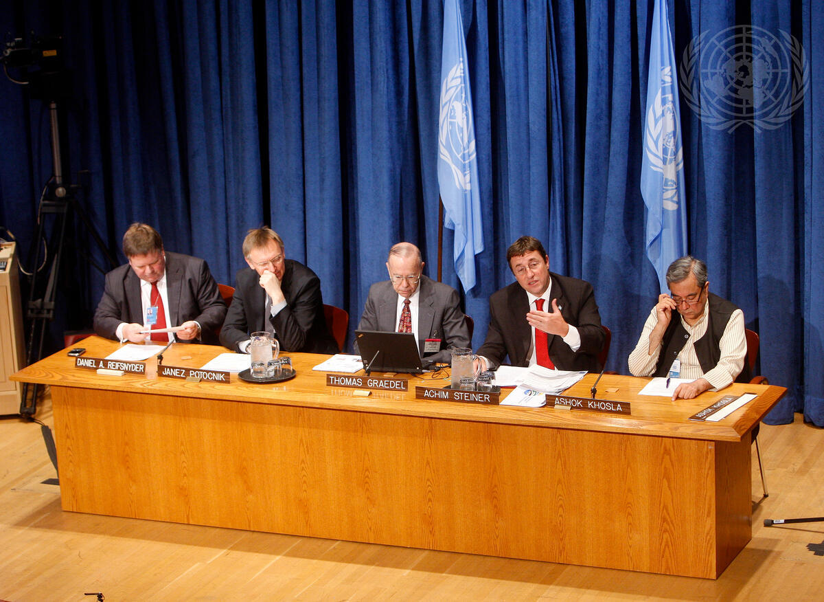 From left to right: Daniel A. Reifsnyder, U.S. Deputy Assistant Secretary of State for Environment; Janez Potocnik, European Commissioner for the Environment; Thomas Graedel, Professor of Industrial Ecology at Yale University and Member of the UN Environment Programme (UNEP)'s International Panel for Sustainable Resource Management; Achim Steiner, UNEP Executive Director; and Ashok Khosla, President of the International Union for Conservation of Nature and Co-Chair of the UNEP Sustainable Resource Panel; attend a press conference launching the Panel's new report on metal stocks and recycling rates.